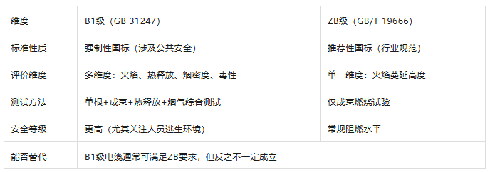 若項(xiàng)目明確要求“B1級(jí)”,僅提供“ZB電纜”可能不符合驗(yàn)收標(biāo)準(zhǔn);而符合B1級(jí)的電纜,一般都能通過(guò)ZB甚至ZA的成束燃燒測(cè)試。